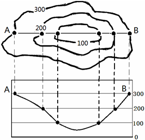 分析:在等高线地形图上,等高线闭合且等高线数值中间高四周低则为山顶;两山顶之间相对低洼的部位为鞍部;高线闭合且等高线数值中间低四周高则为盆地;等高线向海拔低处凸为山脊;等高线向海拔高处凸为山谷,等高线重合的地方为陡崖.在等高线地形图上,等高线越密集,表示坡度越陡,等高线越稀疏,表示的坡度越缓.