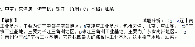£¨2£©Ì©ÖÝλÓÚ________ ¹¤Òµ»ùµØ£¨Ìî×Öĸ£©£¬ËüÊÇÎÒ¹ú×î´óµÄ×ÛºÏÐÔ¹¤Òµ»ùµØ£¬ÕâÀïÊ¢²ú________£¨ ÌîÁ¸Ê³×÷Î ________ £¨ÌîÓÍÁÏ×÷Î¡£