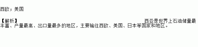 西欧;美国 【解析】西亚是世界上石油储量最丰富、产量最高、出口量最多的地区,主要输往西欧、美国、日本等国家和地区。