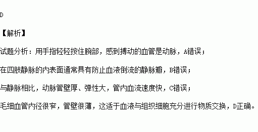 D.毛细血管内径很窄,管壁很薄,这适于血液与组织细胞充分进行物质交换