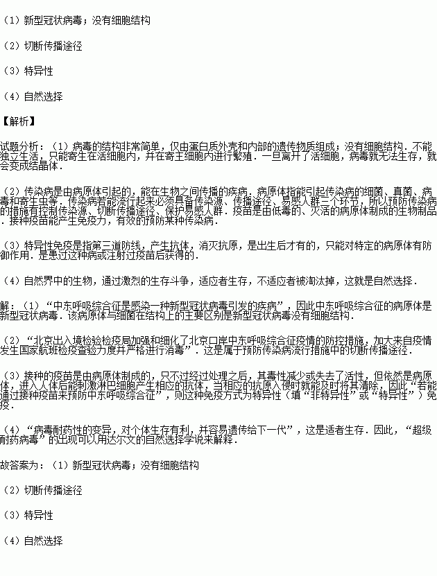 (3)中东呼吸综合征尚无疫苗,科学家们正在加紧研制中东呼吸综合征疫苗,若能通过接种疫苗来预防中东呼吸综合征,则这种免疫方式为 (填“非特异性”或“特异性”)免疫.