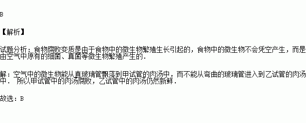 某生物兴趣小组为探究食品腐败的原因,设计了如下实验:取两个规格相同的烧瓶,同时灌入等量的肉汤,煮沸降温后进行持续观察.装置如图所示.预测实验的结果,可能性最大的是( )