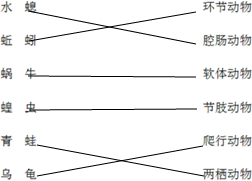 解答:解:水螅属于腔肠动物,青蛙为两栖类,蚯蚓为环节动物,蝗虫为节肢动物,蜗牛属于软体动物,乌龟属于爬行动物.