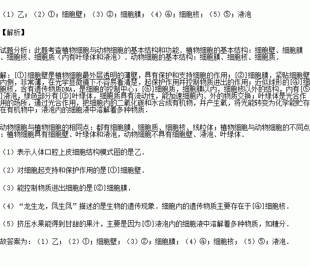 (1)表示人体口腔上皮细胞结构模式图的是 (填“甲”或“乙”).