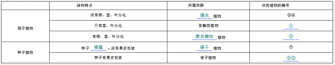 | 结构特点 | 所属类群 | 该类植物的编号 | |
