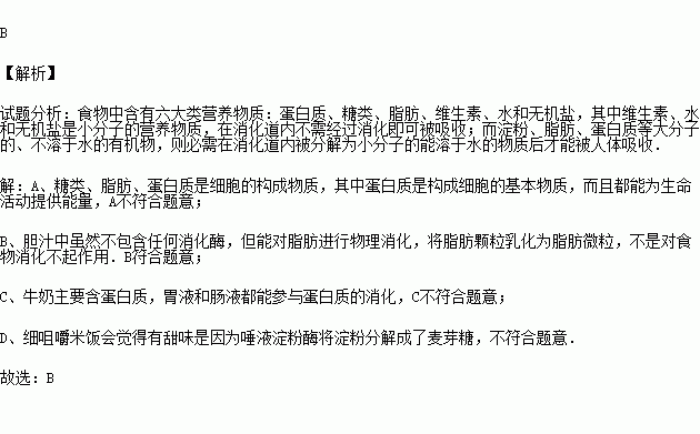 下列关于食物的营养成分和消化的说法中,不正确的是( )