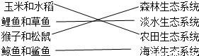 解答:解:玉米和水稻是农作物,属于农田生态系统,鲤鱼和草鱼生活在淡水中,属于淡水生态系统,猴子和松鼠生活在森林中,属于森林生态系统,鲸鱼和鲨鱼是海洋动物,生活在海洋中,属于海洋生态系统.