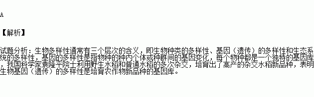 我国科学家袁隆平院士利用野生水稻和普通水稻的多次杂交,培育出了高产的杂交水稻新品种,这是利用了生物多样性的哪一层次的价值: