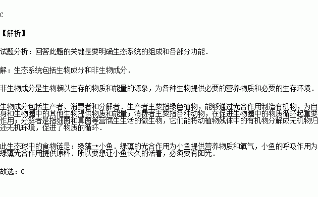 在欧美流行一种生态球,其中有绿藻、2~3条小鱼、泥沙等,在这个处于平衡状态的封闭生态系统中,要使小鱼长时间存活必须要提供( )