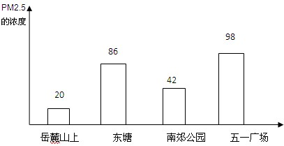 分析:对照实验是指在研究一种条件对研究对象的影响时,所进行的除了这种条件不同以外,其他条件都相同的实验,本实验中,研究的是空气中PM2.5的浓度与植被的多少的关系.在探究过程中,还需要排除偶然因素的影响. 解答:解:(1)“为了探究植被能否降低空气中PM2.5的浓度”,实验的变量应为植被的多少,所以实验选取了植被多少不同的岳麓山上、东塘、南郊公园、五一广场. (2)同一地点选择不同的位置进行检测,而不是全部,可见使用的调查方法是抽样检测. (3)为了使抽样检测的结果接近总体真实情况,抽样时应当尽量避免主观因素的影响,求平均值. (4)以地点为横坐标,PM2.5的浓度为纵坐标,不同地点PM2.5的浓度的柱状图为 (5)由表中数据可知,植被越多的地方(岳麓山上)PM2.5的浓度越小,植被能够降低空气中PM2.5的浓度. (6)根据实验结论可知,多植树造林(倡导低碳出行等). 故答案为:(1)植被的多少 (2)抽样 (3)求平均值 (4) (5)植被能够降低空气中PM2.5的浓度. (6)多植树造林(倡导低碳出行等) 点评:通过热点问题,引导学生关注生活.这是中考的热点.