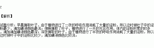 在同一植株上分别于早晨、傍晚、深夜摘取相同的三片叶片,用打孔器在叶片上取同样大小的圆片,进行脱色后,用碘处理,结果是
