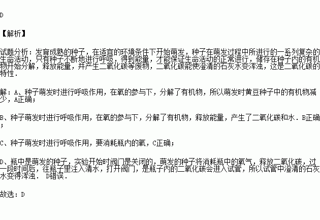 如图所示,广口瓶里装着萌发的黄豆种子,试管里装有澄清的石灰水.开始时,广口瓶和试管之间的阀门关闭,过一段时间后,拿去棉花通过漏斗往瓶子里注入清水并打开阀门,不久发现澄清的石灰水变浑浊.以下有关说法错误的是( )