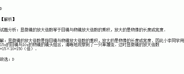 小李同学用15x的目镜与10 x的物镜的镜头组合.清晰地观察到了一只草履虫.这时显微镜的放大倍数是( )
