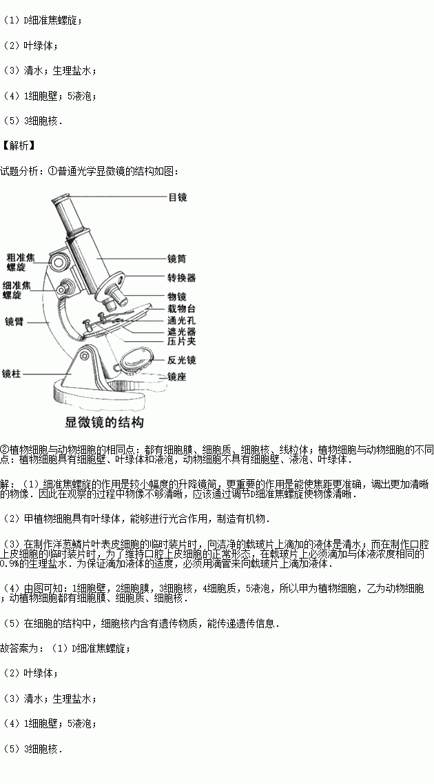 (3)制作洋葱表皮细胞和人的口腔上皮细胞时,向载玻片上滴加的液滴分别是 和