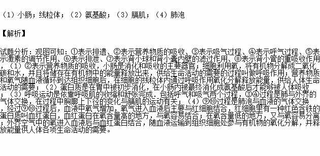 (4)⑨⑩过程是 与血液的气体交换,经过⑨⑩过程后,血液中氧气增加。氧气进入血液后主要与血红蛋白结合,通过血液循环运送到全身各处。