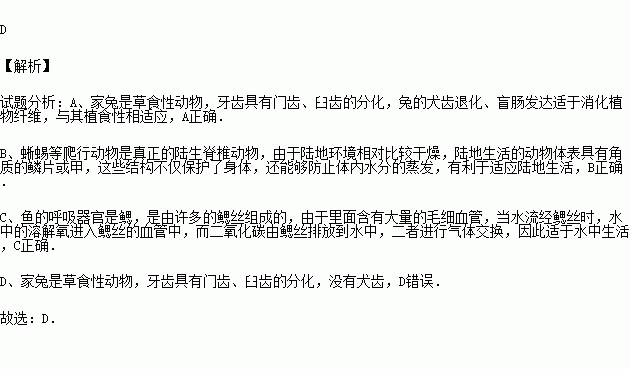 D.家兔与食草生活相适应的特征是有发达的门齿、臼齿和锋利的犬齿