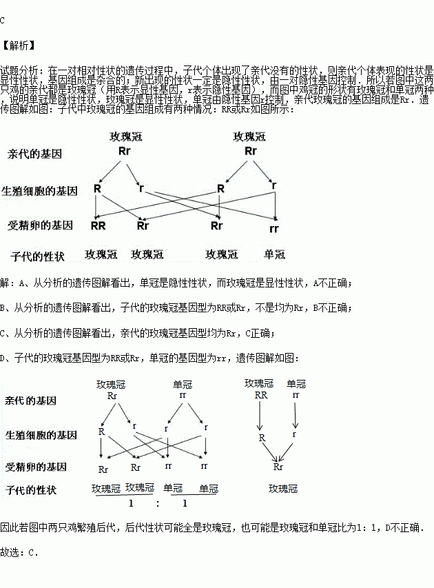 鸡冠的形状有玫瑰冠和单冠两种(如图所示),若图中这两只鸡的亲代都是玫瑰冠(用R表示显性基因,r表示隐性基因),以下叙述正确的是( )