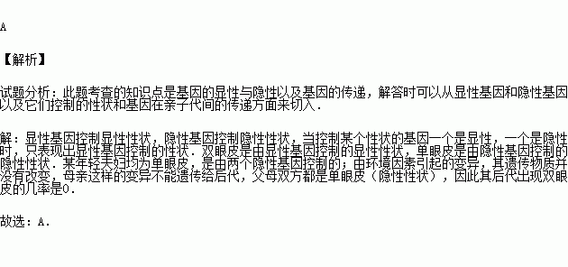 人类双眼皮为显性,单眼皮为隐性.某年轻夫妇均为单眼皮,生了一个单眼皮的女孩.后来母亲去美容院通过外科手术变成双眼皮,该夫妇如果再生一个孩子是双眼皮的机率为( )