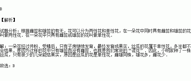 丝瓜是人们喜爱的一种蔬菜,小明家种了一株丝瓜,到了开花季节,每天开几十朵,但只有很少的几朵能结果实,原因是( )