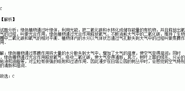 大自然是我们绝好的课堂.当你和同学们漫步绿树成荫、遍地青草的林问小路上,你会感觉到空气特别地清新和湿润,此时你会想到这是绿色植物的什么作用改善了空气的质量( )