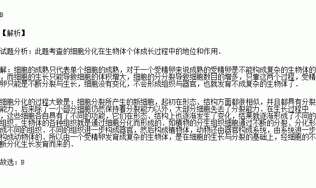 在生物的个体发育中,一个受精卵能发育成复杂的生物体.生物体之所以复杂,主要是下列哪一生理过程在起作用( )