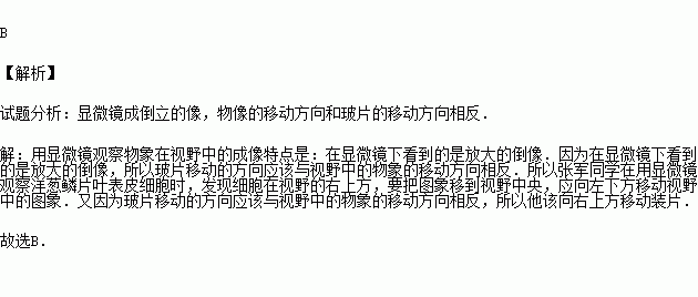 小明在观察某动物细胞结构时,看到右上方有一个正在分裂的细胞大部分图象,他想将此细胞移到视野中央,该将玻片移向( )