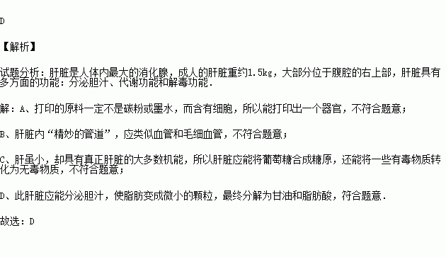 D.此肝脏应能分泌胆汁,使蛋白质变成微小的颗粒,最终分解为甘油和脂肪酸