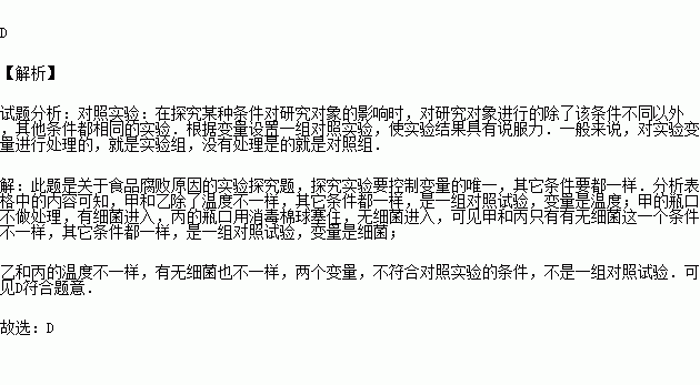 为了探究食品腐败的原因和细菌生存的条件,生物兴趣小组用己消毒的甲、乙、丙三个相同锥形瓶,按下表进行了实验.请分析表中包含了几组对照实验?变量分别是什么?( )