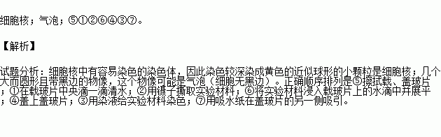 制作洋葱鳞片叶表皮细胞临时装片时,经过染色后,在细胞的中央可以看见一个被染成黄色的近似球形的小颗粒,叫 ;王芳同学在观察时在视野中清晰的看到了几个大而圆形且中央白亮边缘呈现黑色的物像,这个物像可能是 。以下制作洋葱鳞片叶表皮细胞临时装片的方法步骤,请按正确顺序排列: 。①在载玻片中央滴一滴清水;②用镊子撕取实验材料;③用染液给实验材料染色;④盖上盖玻片;⑤擦拭载、盖玻片;⑥将实验材料浸入载玻片上的水滴中并展平,⑦用吸水纸在盖玻片的另一侧吸引。