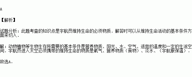 2005年10月12日9时,由中国自行研制的“神舟六号”飞船载着宇航员费俊龙和聂海盛升入太空,并在太空遨游115小时,完成了多项空中实验,请问下列哪项不是宇航员必须携带的维持生命的物质( )