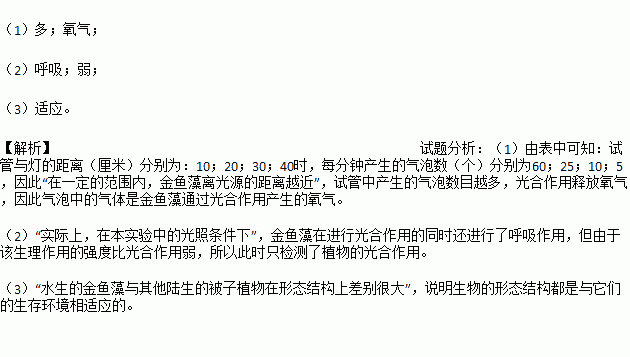 £¨1£©ÔÚÒ»¶¨µÄ·¶Î§ÄÚ£¬½ðÓãÔåÀë¹âÔ´µÄ¾àÀëÔ½½ü£¬ÊÔ¹ÜÖвúÉúµÄÆøÅÝÊýĿԽ____¡£ÆøÅÝÖÐµÄÆøÌåÊǽðÓãÔåͨ¹ý¹âºÏ×÷ÓòúÉúµÄ_________¡£