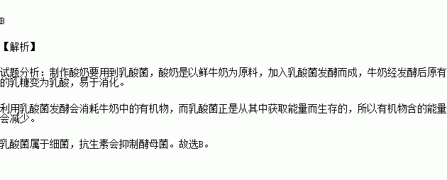 B.发酵后有机物种类增加 D.抗生素会抑制酸奶发酵