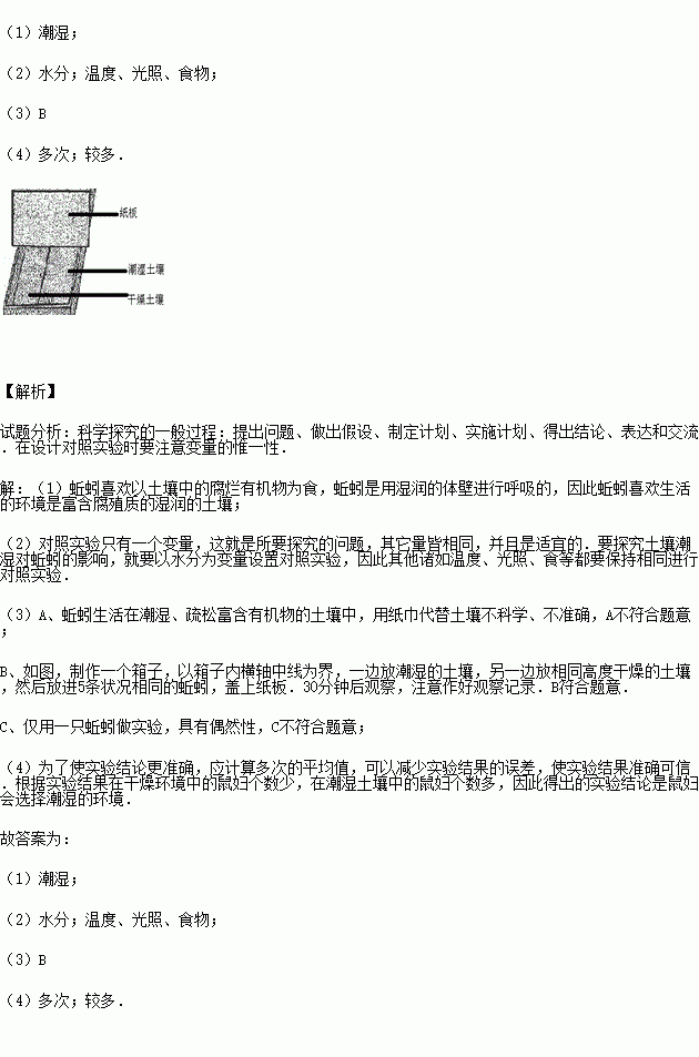 ¿ÆÑ§Ì½¾¿£ºÍ¨¹ýÔĶÁ¿ÎÎÄ£¬Àî»ÔͬѧÁ˽âÁËòÇò¾µÄÉú»îϰÐÔ£ºòÇò¾Éú»îÔÚ¸»º¬¸¯Ö³Öʵġ¢ÊªÈóµÄÍÁÈÀÖУ¬Öç·üÒ¹³ö£¬ÒÔÍÁÈÀÖеĿÝÒ¶µÈÓлúÎï×÷ΪʳÎ¶Áºó£¬Àî»Ôͬѧ¶ÔòÇò¾µÄÉú»î»·¾³·¢ÉúÐËȤ£ºòÇò¾µ½µ×ÊÇϲ»¶Éú»îÔÚ³±ÊªµÄ»·¾³ÖУ¬»¹ÊǸÉÔïµÄ»·¾³ÖУ¿Îª´Ë£¬Àî»Ôͬѧ½øÐÐÁËÈçÏÂÒ»·¬Ñо¿£¬²¢ÑûÄãÒ»ÆðÀ´²ÎÓë