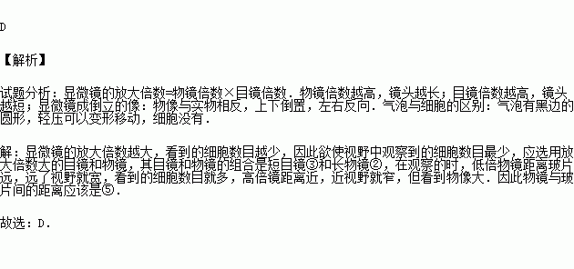 如图所示,①②为两种放大倍数不同的物镜,③④为两种放大倍数不同的目镜,⑤⑥为观察到清晰物像时物镜与玻片之间的距离.下列哪种组合观察到的细胞数目最少( )