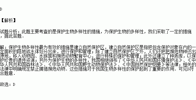 ①建立自然保护区 ②将濒危动物迁出,进行特殊保护