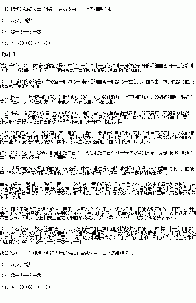 (1)若图中①表示肺部毛细血管,该处毛细血管有利于气体交换的分布特点是 .