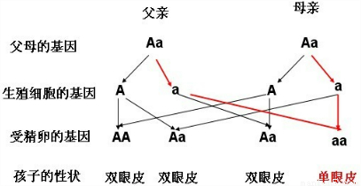 (2)子代个体中出现了亲代没有的性状,新出现的性状一定是隐性性状,亲代的基因组成是杂合的;双眼皮的夫妇却生了一个单眼皮的孩子,说明夫妇双方控制眼皮的基因组成不是纯合的,即都含有一个控制双眼皮的显性基因和一个控制单眼皮的隐性基因,孩子的单眼皮是隐性性状,双眼皮是显性性状.