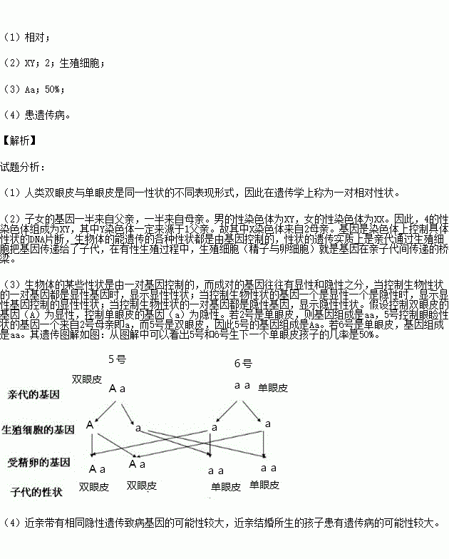 (3)若2号是单眼皮,5号是双眼皮,5号的基因组成是 ,若6号是单眼皮,5号和6号生下一单眼皮孩子的几率是 。