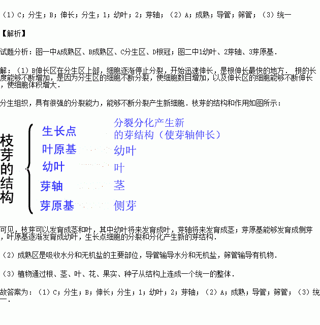 图一所示的是根尖的结构,图二和图三所示的分别是叶芽的结构及其发育而成的枝条,请根据图回答下列问题: