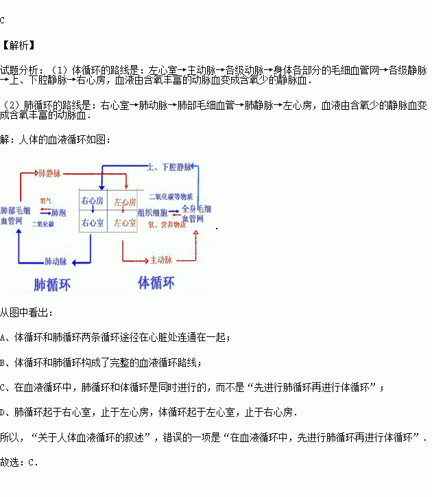 D.肺循环起于右心室,止于左心房,体循环起于左心室,止于右心房