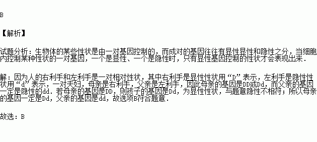 已知人的右利手和左利手是一对相对性状,其中右利手是显性性状用“D”表示,左利手是隐性性状用“d”表示,一对夫妇,母亲是右利手,父亲是左利手,他们的孩子是左利手,那么这对夫妇的基因组成时( )