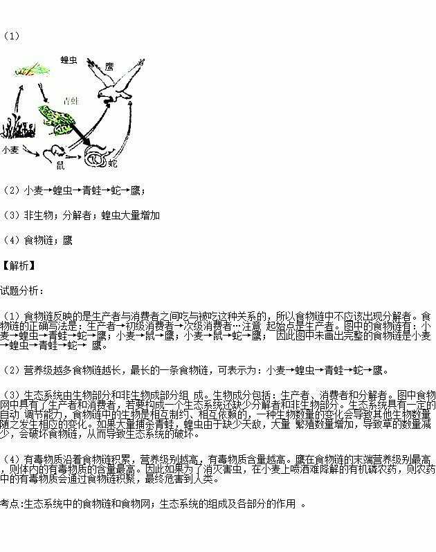 (4)如果为了消灭害虫,在小麦上喷洒难降解的有机磷农药,则农药中的有毒物质会通过积聚,最终受害的是 。