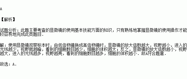 在利用显微镜观察细胞的实验中,当换用高倍镜后,视野中的细胞数目,细胞体积和视野亮度依次有什么变化?( )