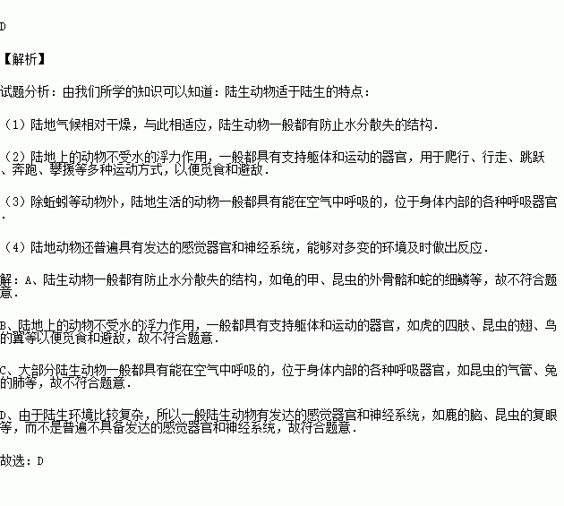 D.陆生动物普遍不具备发达的感觉器官和神经系统