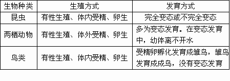 列表比较昆虫、两栖动物和鸟类的生殖和发育方式: