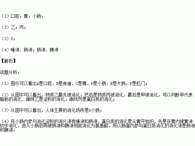 (4)在小肠内参与消化乙物质的消化液主要有 .在小肠内参与消化丙物质的消化液主要有 .