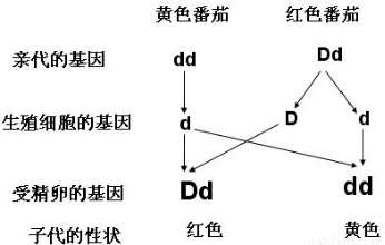 B、生物体的某些性状是由一对基因控制的,当细胞内控制某种性状的一对基因一个是显性、一个是隐性时,只有显性基因控制的性状才会表现出来.将红色番茄(Dd)的花粉授到黄色番茄(dd)的柱头上,则产生的种子的基因组成如图所示:即Dd或dd;果实的果皮是由黄色番茄的子房壁发育成的,其基因组成是dd,因而性状是黄色.因此黄色番茄植株上所结种子的基因型是Dd或dd,果皮的颜色是黄色.故符合题意;