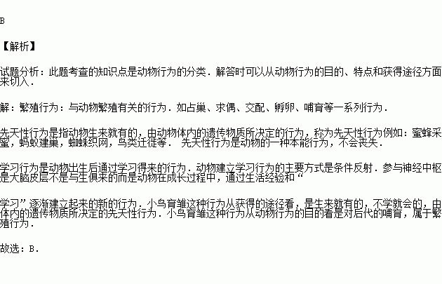 小鸟育雏这种行为从获得的途径和现象看分别属于( )