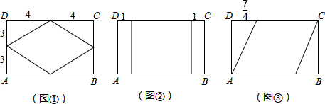 如图,矩形ABCD中,AB=8,BC=6,请在下图中画出面积不相等的三个菱形大致图形,使菱形的顶点都在矩形的边上,并直接写出你画的菱形的边长.