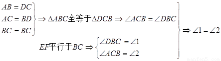 如图,AB = DC,AC = BD,AC、BD交于点E,过E点作EF//BC交CD于F。